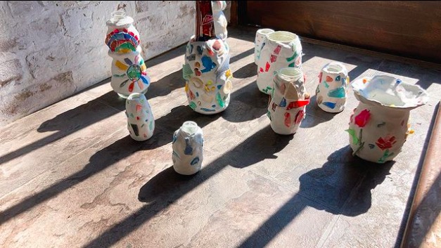 ▲ワークショップの様子。再生パルプ粘土と色とりどりの海洋プラスチックで自分だけの花瓶&植木鉢づくり。栞奈さんがビーチクリーンアップ団体などから集めたカラフルな海洋プラスチックで飾りつけをする